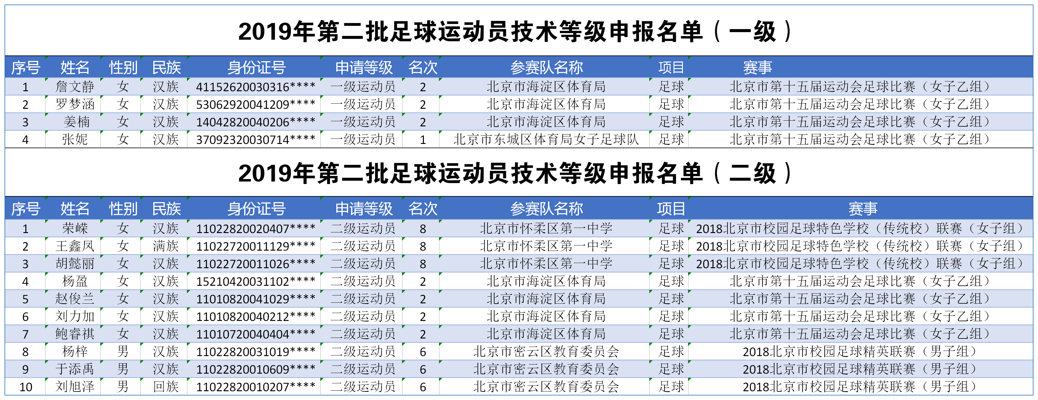 各相关单位: 根据《中国足球协会足球运动员技术等级管理办法》和《中国足球协会足球运动员等级标准》(足球字〔2018〕第81号)相关要求,现对拟授予一级运动员称号的詹文静等4人和二级运动员称号的荣嵘等10人进行公示,公示期为2019年3月26日至2019年4月2日。(名单见附件) 公示期内,如对上述名单有异议,任何单位和个人均可以电话、书面或其他形式向北京足协会员注册部反映。以单位名义反映问题的,须加盖单位公章;以个人名义反映问题的,须署名或当面反映。如对相关信息予以更正的,须向会员注册部提供书面说明和相关材料。