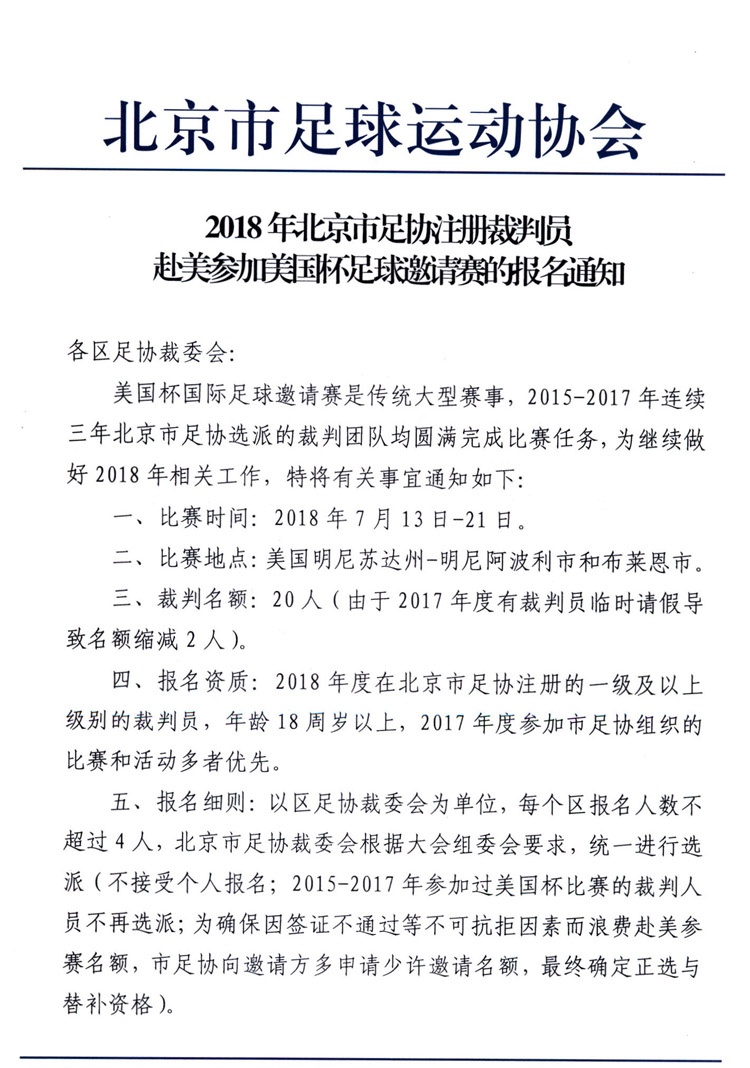 2018年北京市足协注册裁判员赴美参加美国杯足球邀请赛的报名通知