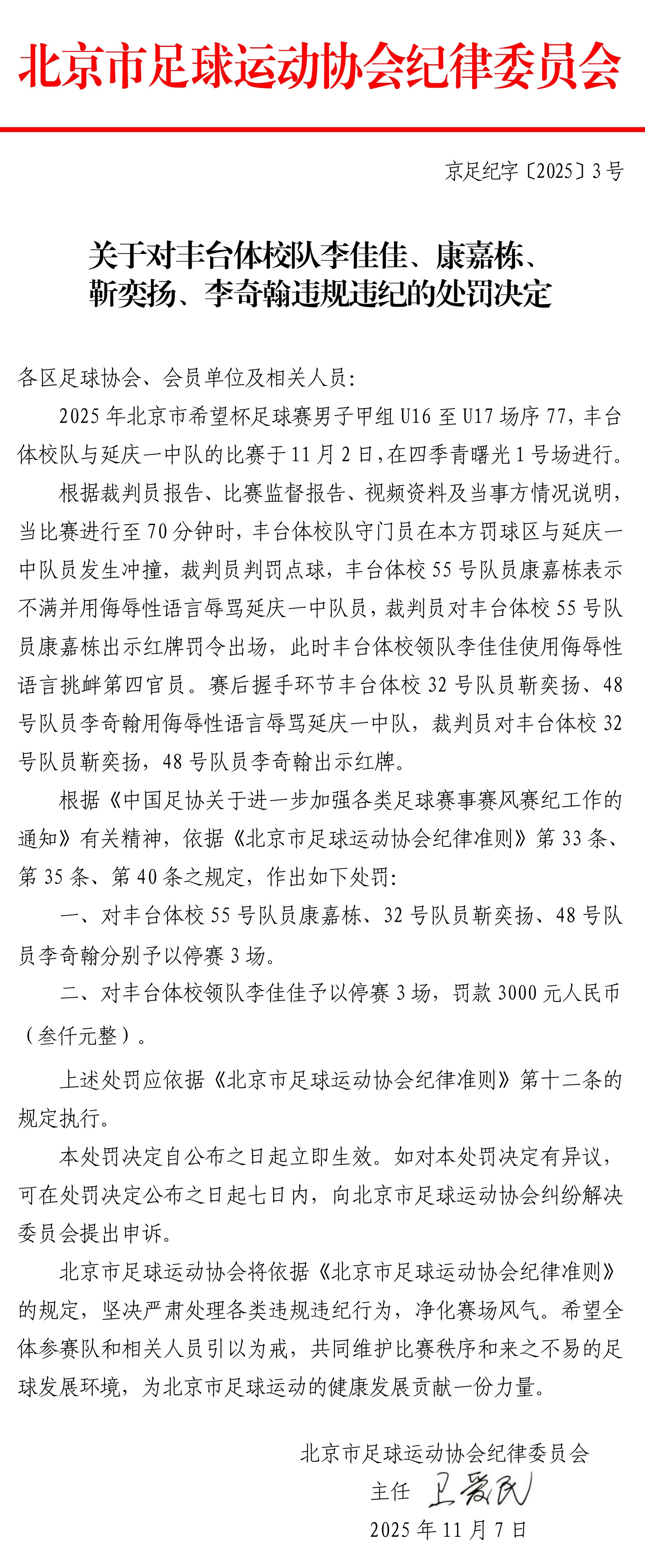 关于对丰台体校队李佳佳、康嘉栋、靳奕扬、李奇翰违规违纪的处罚决定