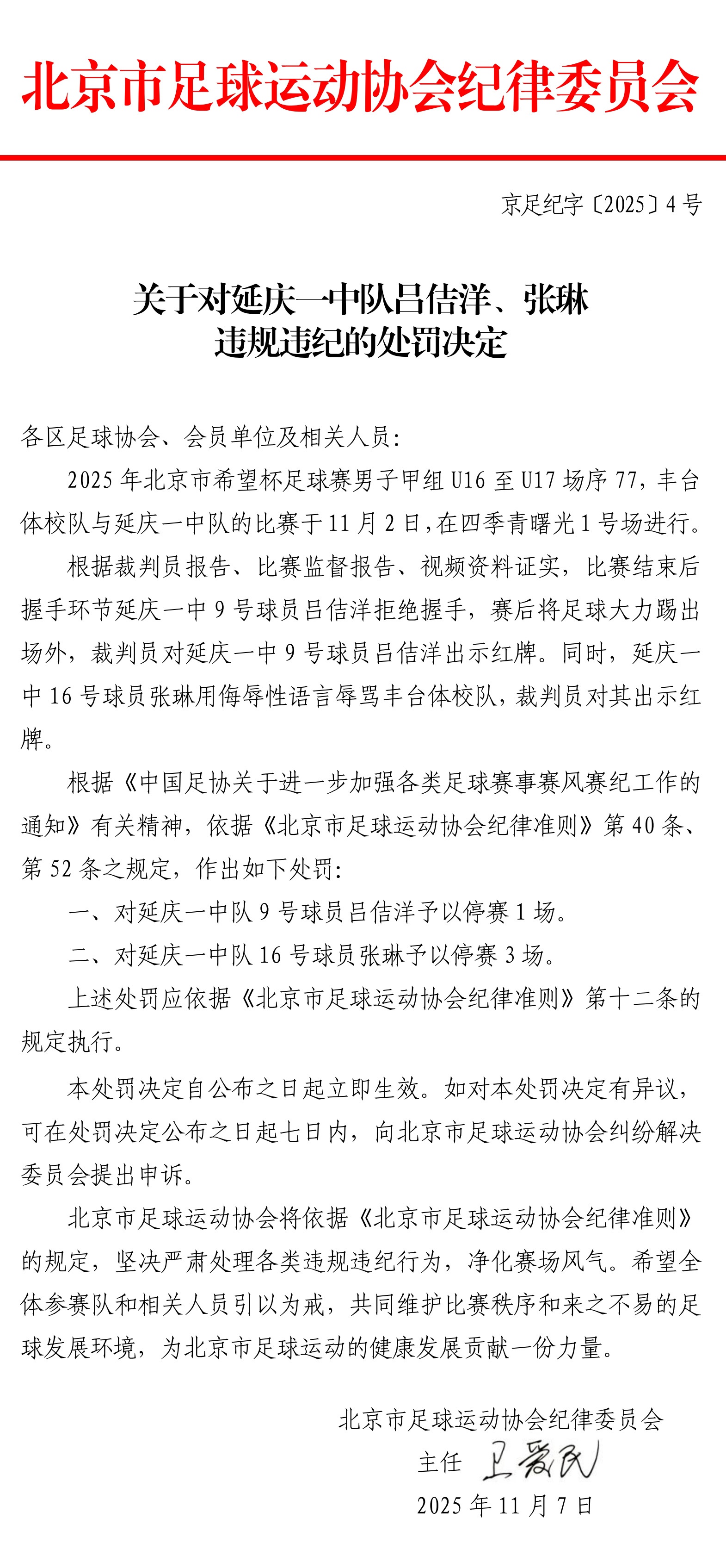 关于对丰台体校队李佳佳、康嘉栋、靳奕扬、李奇翰违规违纪的处罚决定