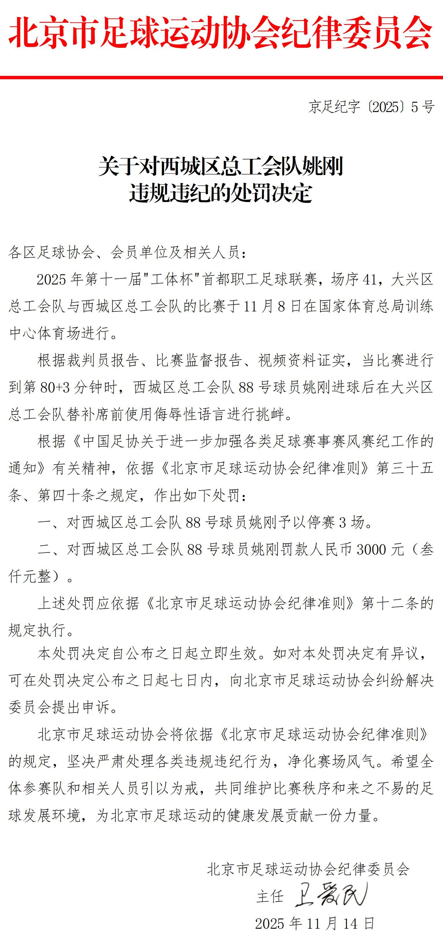 关于对西城区总工会队姚刚违规违纪的处罚决定