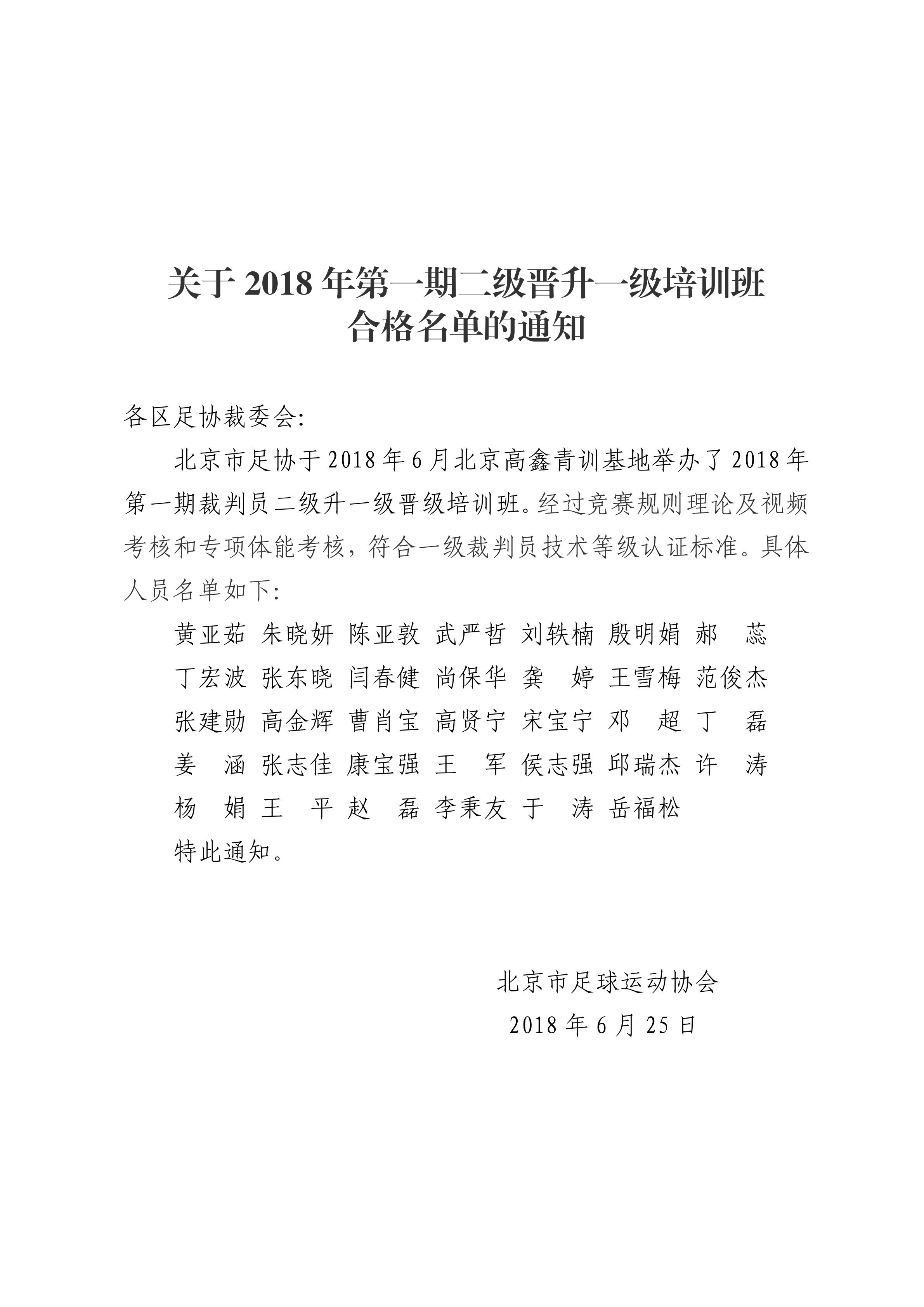 2018年第一期二级升一级裁判员培训班合格通知