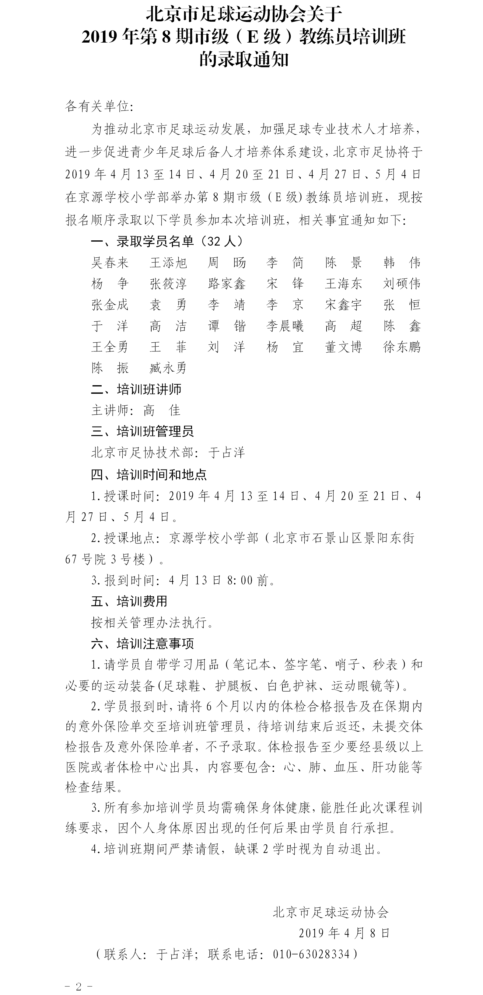 北京市足协关于2019年第8期市级(E级)教练员培训班的录取通知