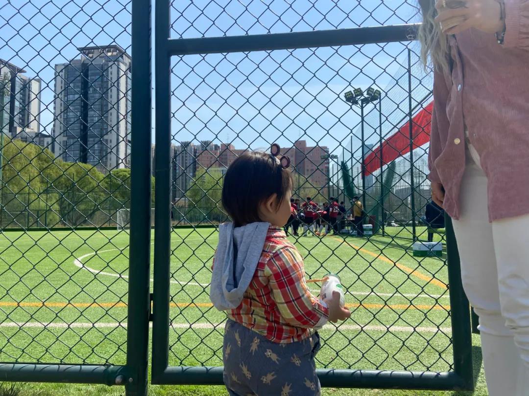 场外的小朋友正给足球场上的爸爸加油打气