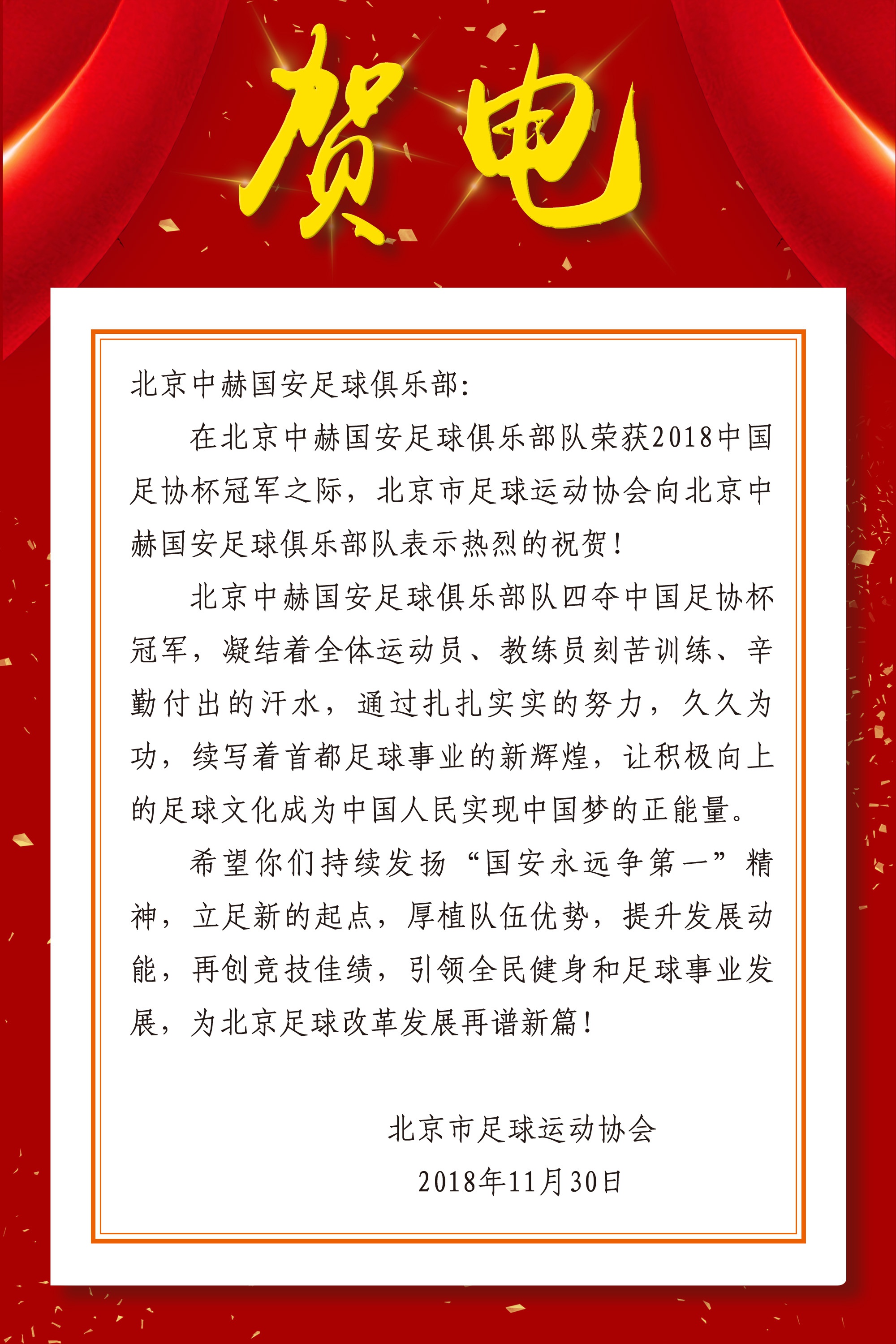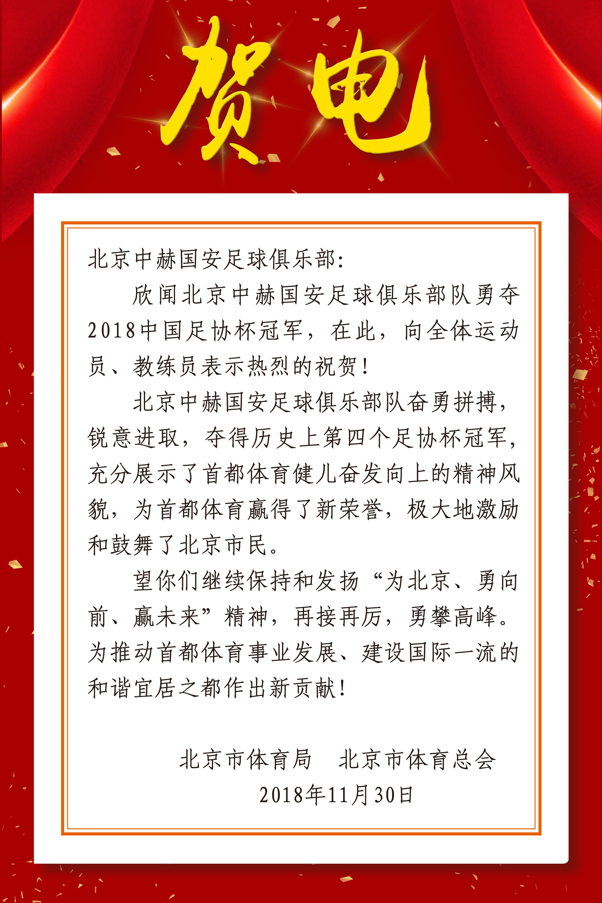 贺电|北京中赫国安足球俱乐部队勇夺2018中国足协杯冠军