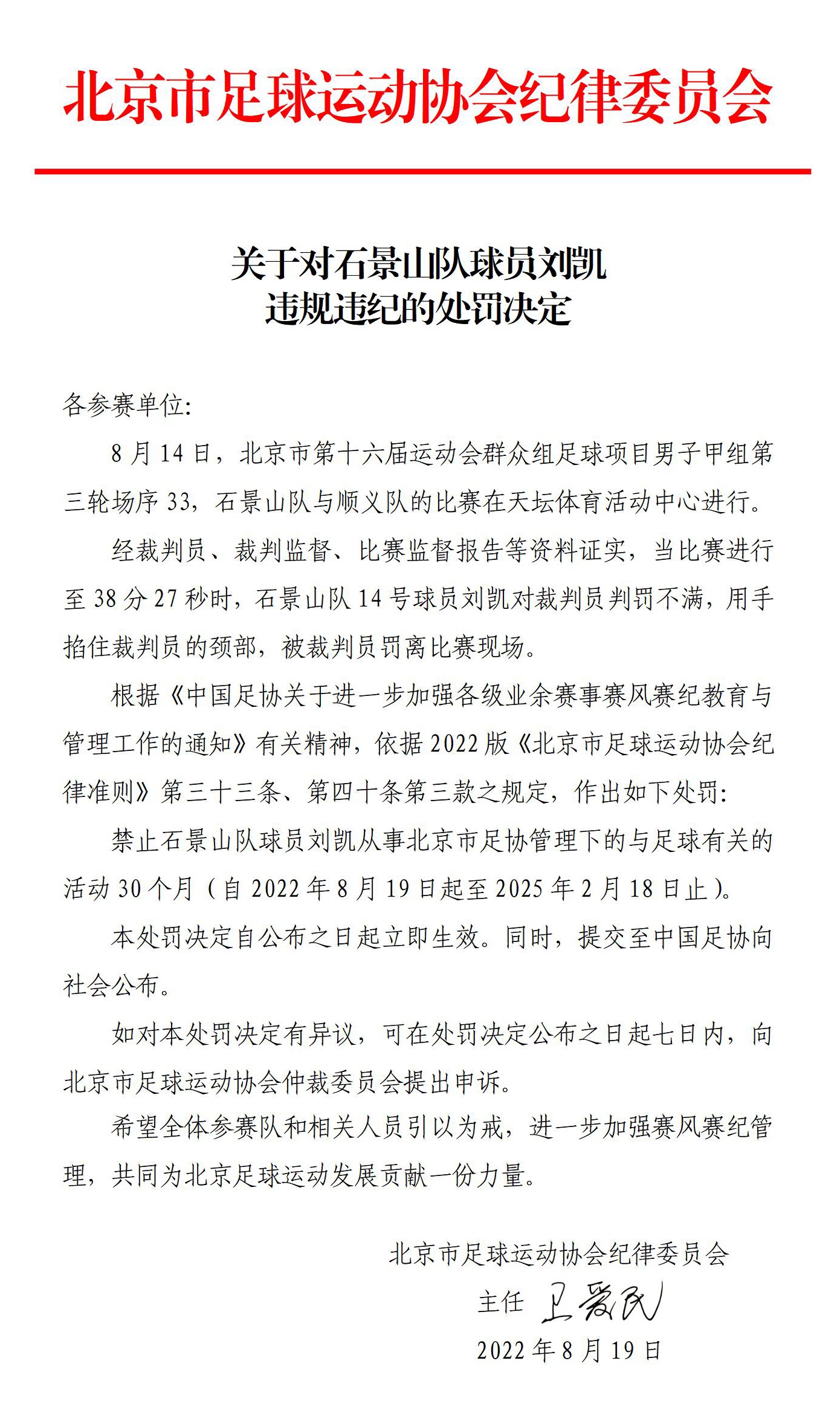 关于对“石景山”队队员刘凯违规违纪的处罚决定