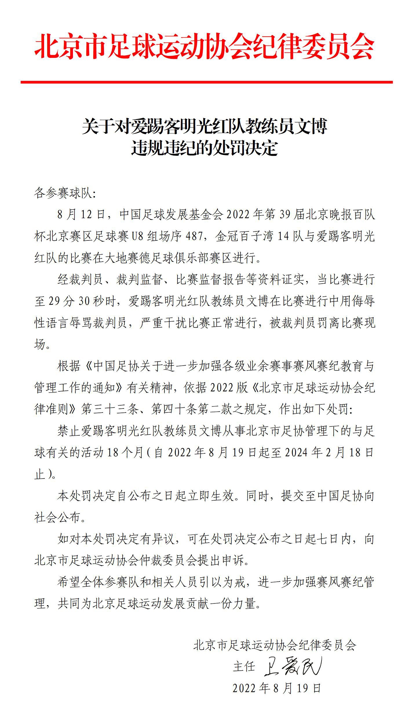 关于对“爱踢客明光红”队教练员文博违规违纪处罚的决定