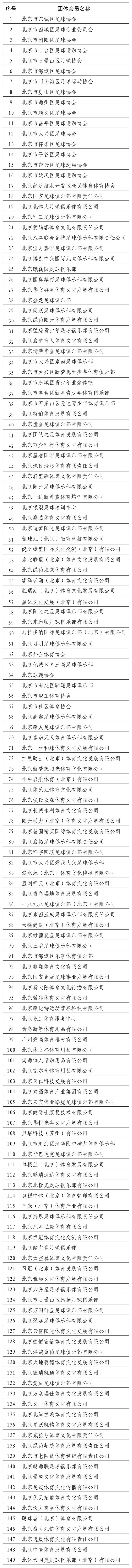 北京市足球运动协会拟于近期召开第八届第一次会员大会。根据《北京市民政局关于印发<北京市社会团体换届选举工作指引(试行)>的通知》(京民社发〔2020〕24号)和《北京市足球运动协会章程》,经北京市足球运动协会第八届换届选举委员会确认,拟对《北京市足球运动协会会员名册》(149家)进行公示,公示期为:2023年5月5日至5月11日。对《北京市足球运动协会会员名册》有异议的团体会员单位,须向第八届换届选举委员会提交加盖公章后的书面材料。