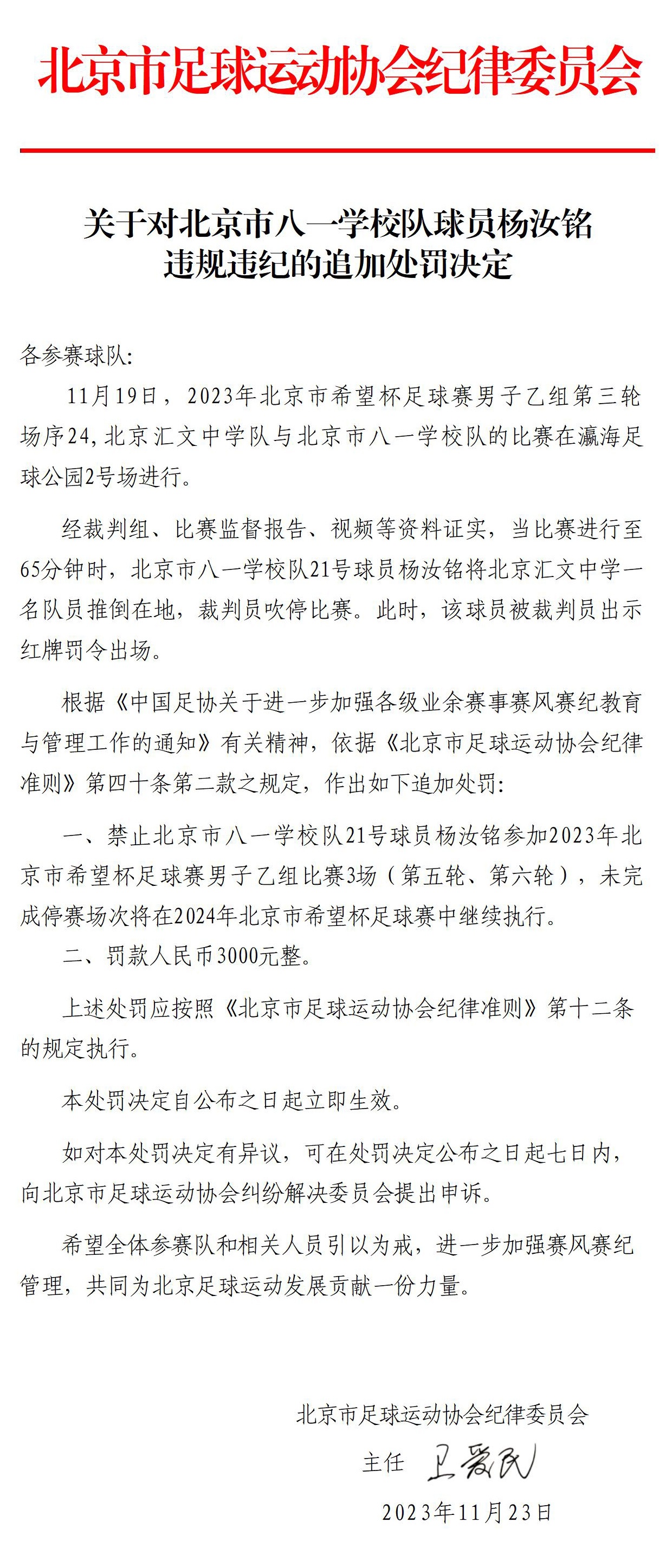 关于对北京市八一学校队球员杨汝铭违规违纪的追加处罚决定