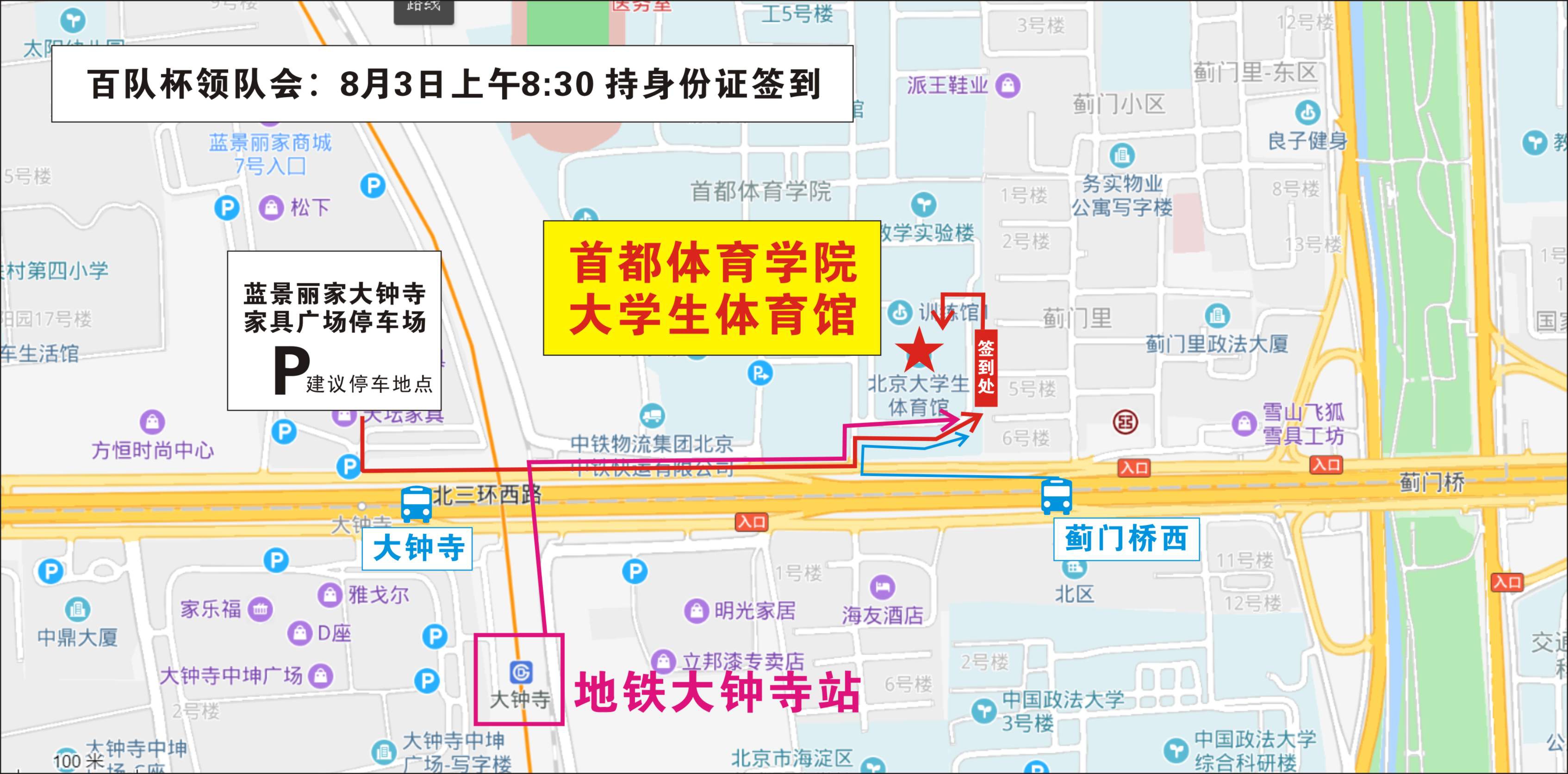首都体育学院大学生体育馆方面为孩子们参加百队杯这项有意义的暑期体育活动而打开绿灯,积极配合,提供领队会的会场。因此,请参赛各队理解和支持,各队相互转告,百队杯领队会将于8月3日上午8时30分在首都体育学院大学生体育馆开始签到,9时30分会议正式举行。首都体育学院大学生体育馆的地址:海淀区北三环南路11号。乘车路线:300路、特8路、425路、79路、94路等线路,蓟门桥西站下车。地铁13号线,大钟寺站下车A口出。温馨提示您,首都体育学院大学生体育馆停车位有限,建议您将车辆停在蓝景丽家或大钟寺附近停车场,绿色出行步行前往会场。