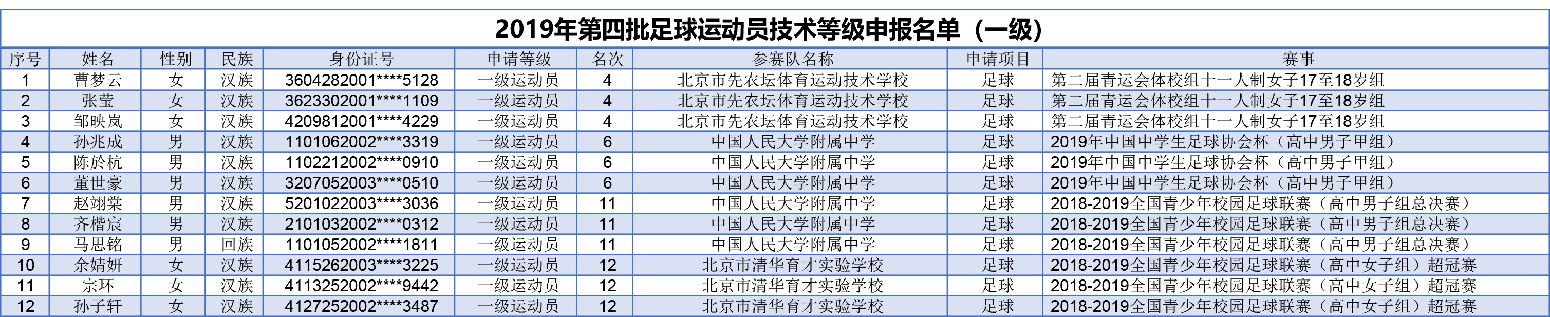 根据《中国足球协会足球运动员技术等级管理办法》和《中国足球协会足球运动员等级标准》(足球字〔2019〕699号)要求,现对拟授予一级运动员称号的曹梦云等12人(见附件1)和二级运动员称号的吴慧琳等23人(见附件2)进行公示,公示期为2019年11月21-27日。