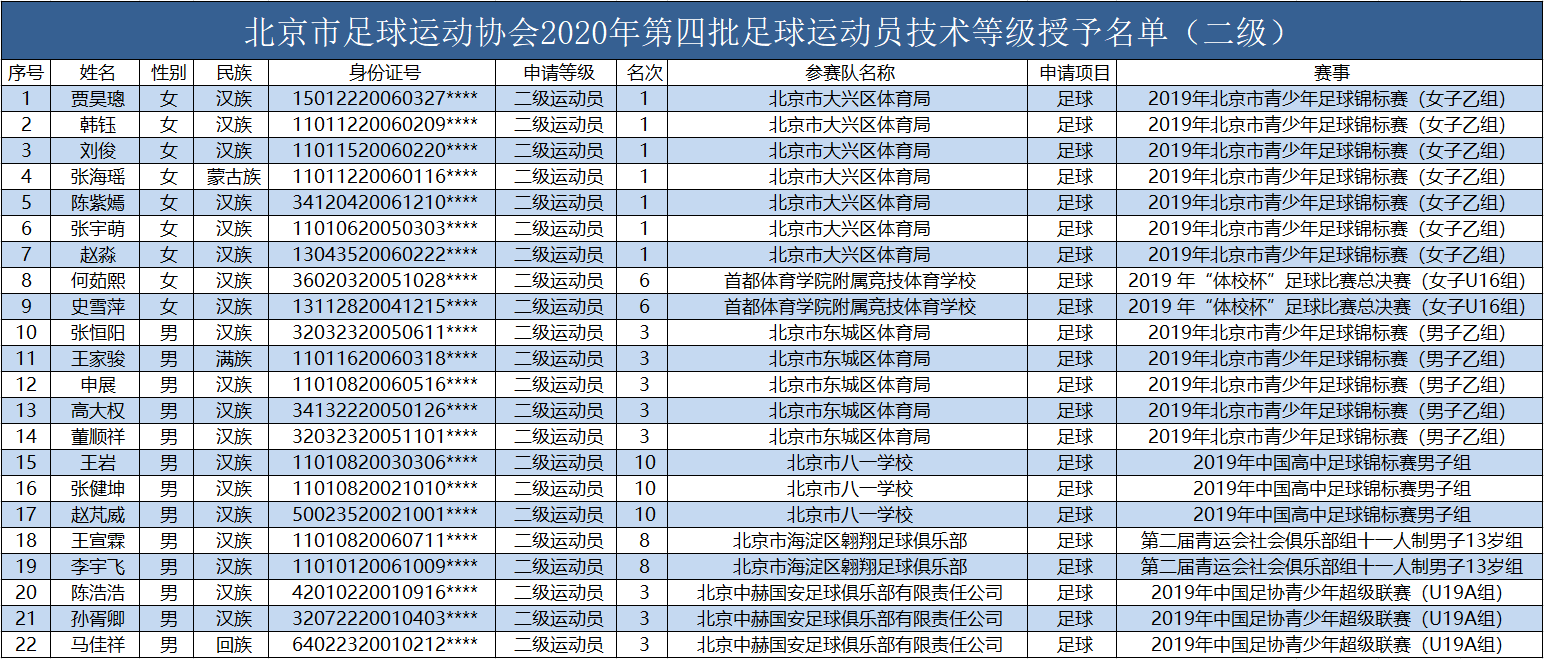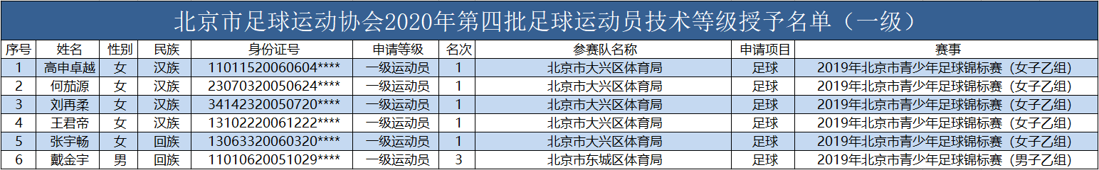 各相关单位: 根据《中国足球协会足球运动员技术等级管理办法(2019版)》《中国足球协会足球运动员技术等级标准(2019版)》文件要求,我协会于2020年7月8-15日对第四批拟授予一级运动员、二级运动员称号的高申卓越等28人(名单见附件)进行了公示,且公示期内无任何异议。现授予高申卓越等28人一级运动员、二级运动员称号。 特此通知。附件:1.2020年第四批足球运动员技术等级授予名单(一级) 2.2020年第四批足球运动员技术等级授予名单(二级) 北京市足球运动协会 2020年7月16日 (联系人:会员场地部 李金龙;电话:010-63162861;电子邮箱:lijinlong0107@hotmail.com)