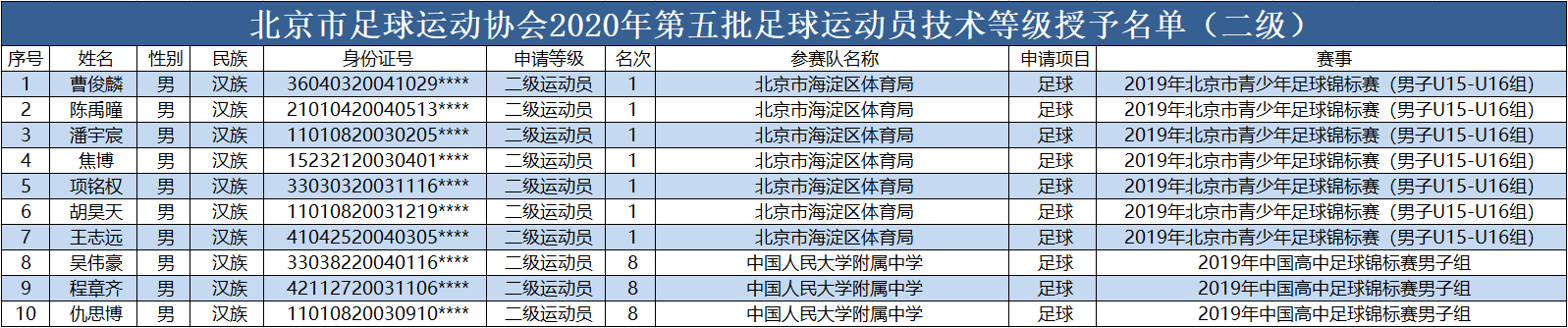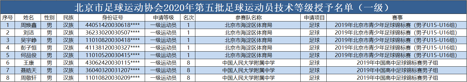 各相关单位: 根据《中国足球协会足球运动员技术等级管理办法(2019版)》《中国足球协会足球运动员技术等级标准(2019版)》文件要求,我协会于2020年7月27-31日对第五批拟授予一级运动员、二级运动员称号的周焕鑫等18人(名单见附件)进行了公示,且公示期内无任何异议。现授予周焕鑫等18人一级运动员、二级运动员称号。 特此通知。 附件:1.2020年第五批足球运动员技术等级授予名单(一级) 2.2020年第五批足球运动员技术等级授予名单(二级)