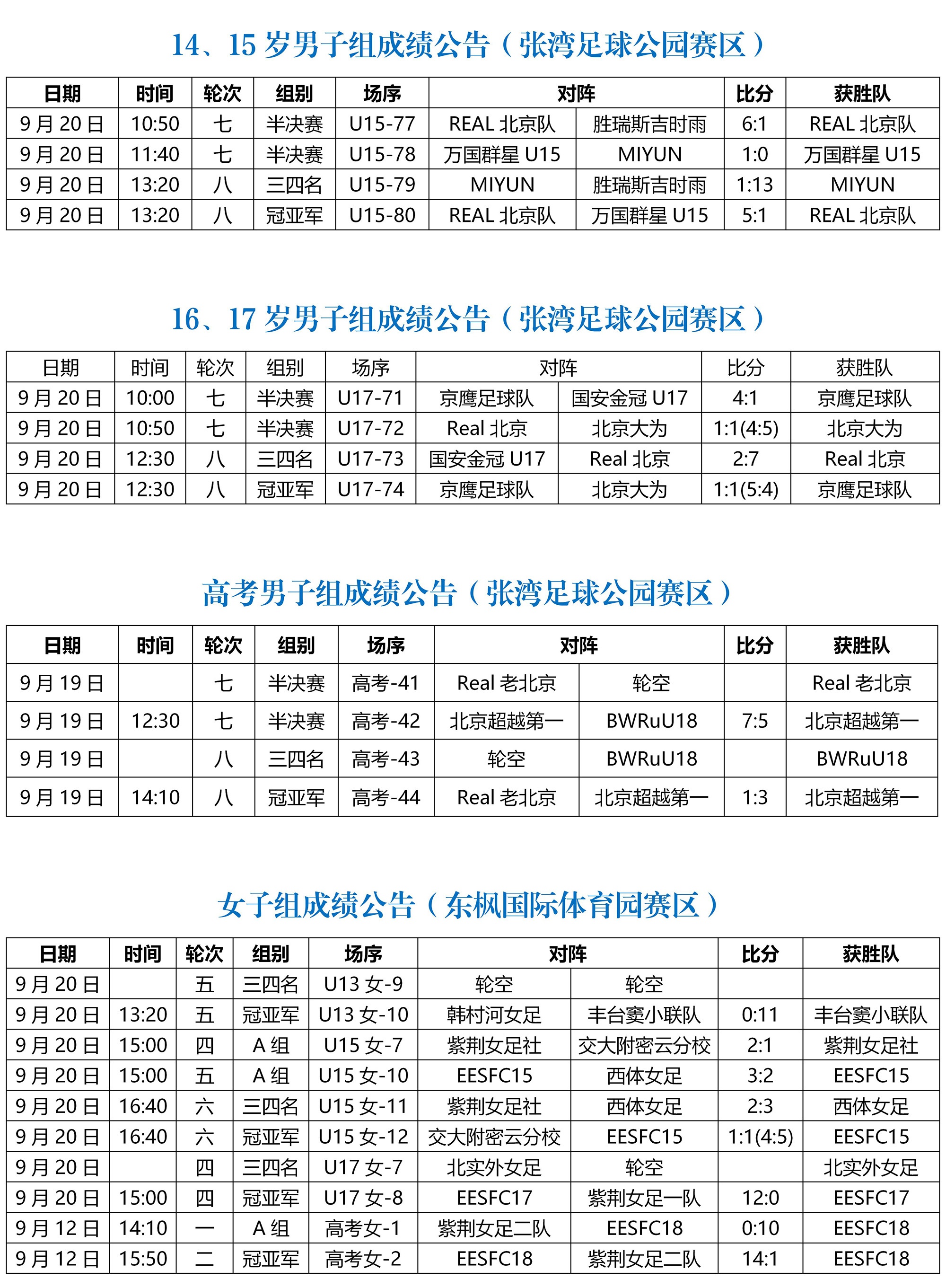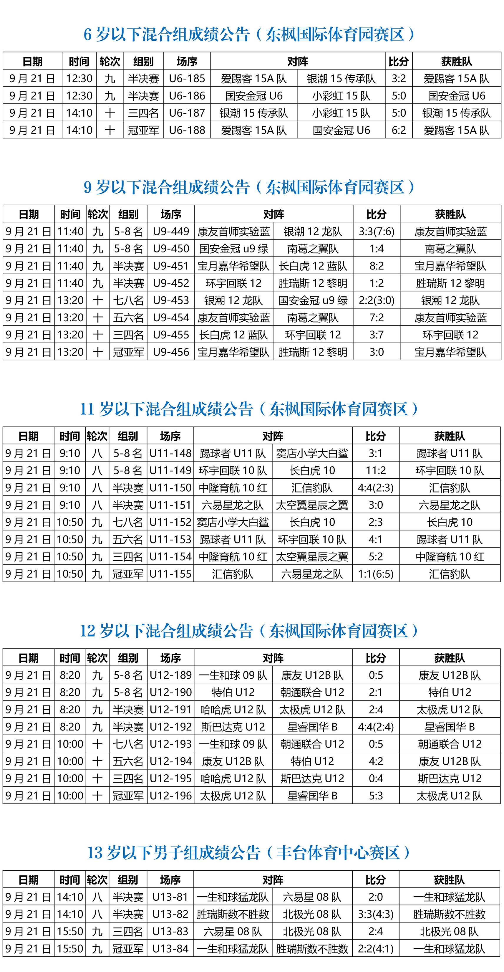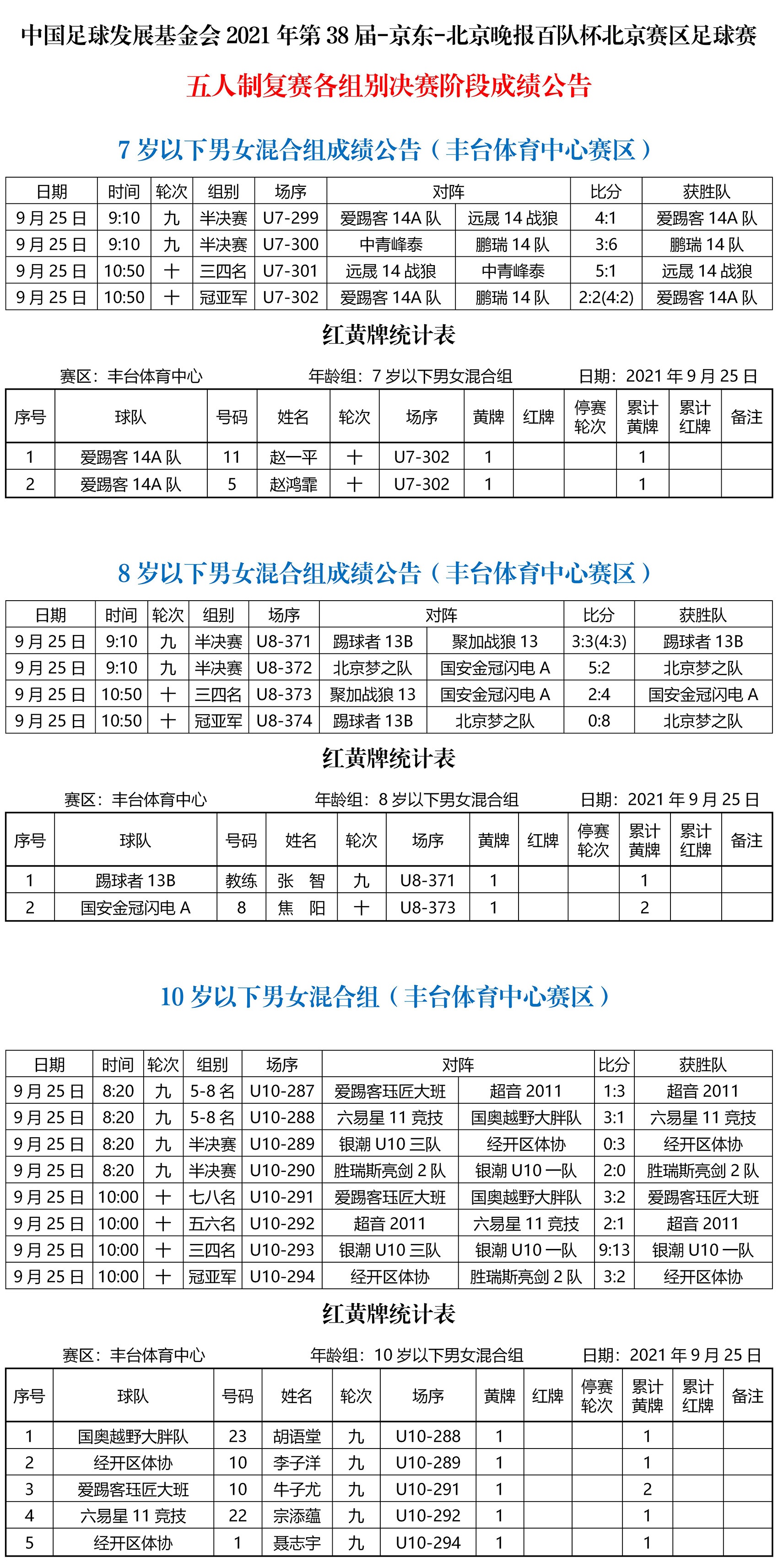 9月25日,中国足球发展基金会2021年第38届-京东-北京晚报百队杯北京赛区五人制足球赛,经过6个比赛日的激烈角逐,五人制比赛正式落下帷幕,各组别冠军揭晓,下面是各组别决赛阶段成绩公告。