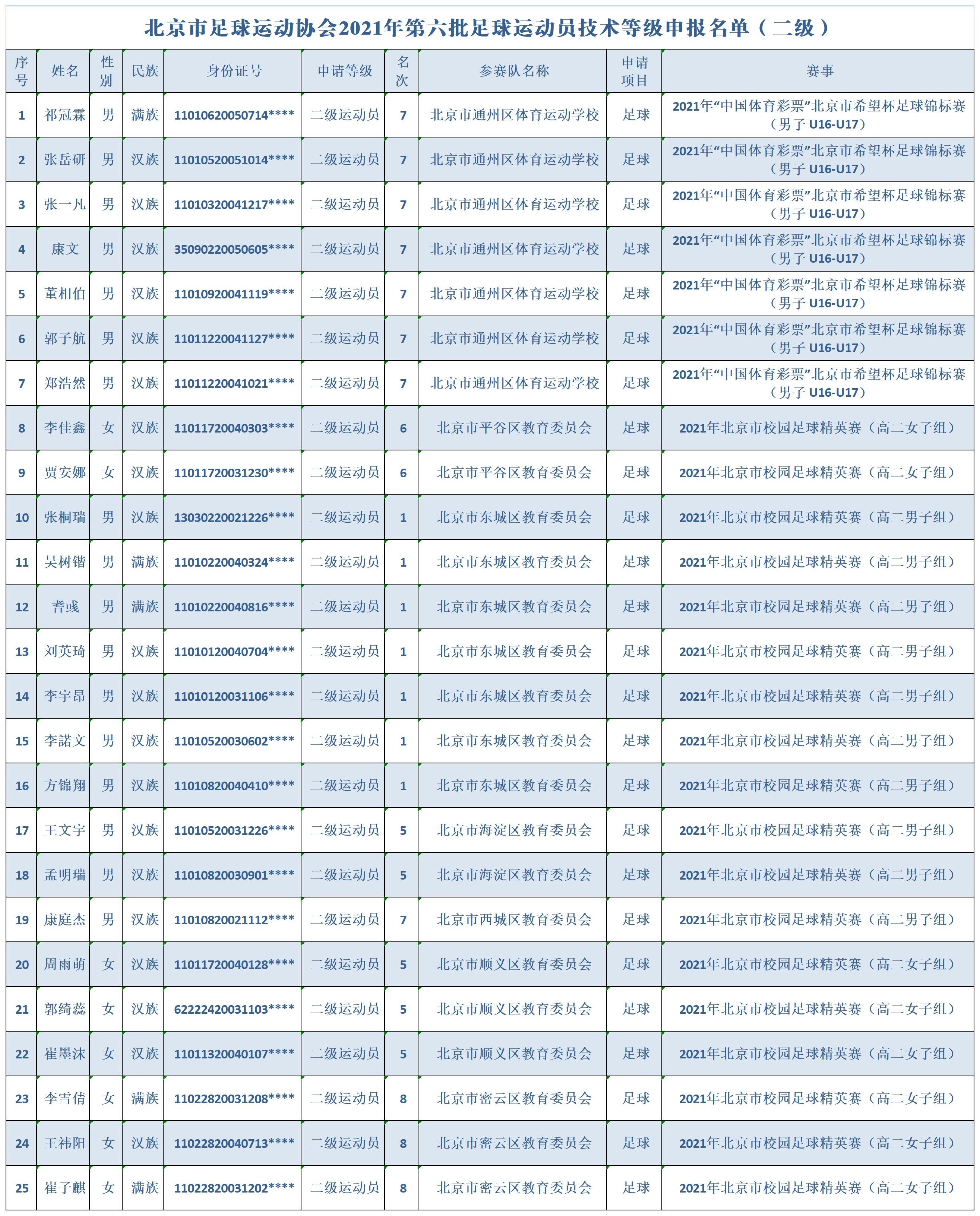 根据《中国足球协会足球运动员技术等级管理办法》和《中国足球协会足球运动员等级标准》(足球字〔2019〕699号)要求,现对拟授予二级运动员称号的祁冠霖等25人(见附件)进行公示。公示期为2021年10月29日-11月4日。