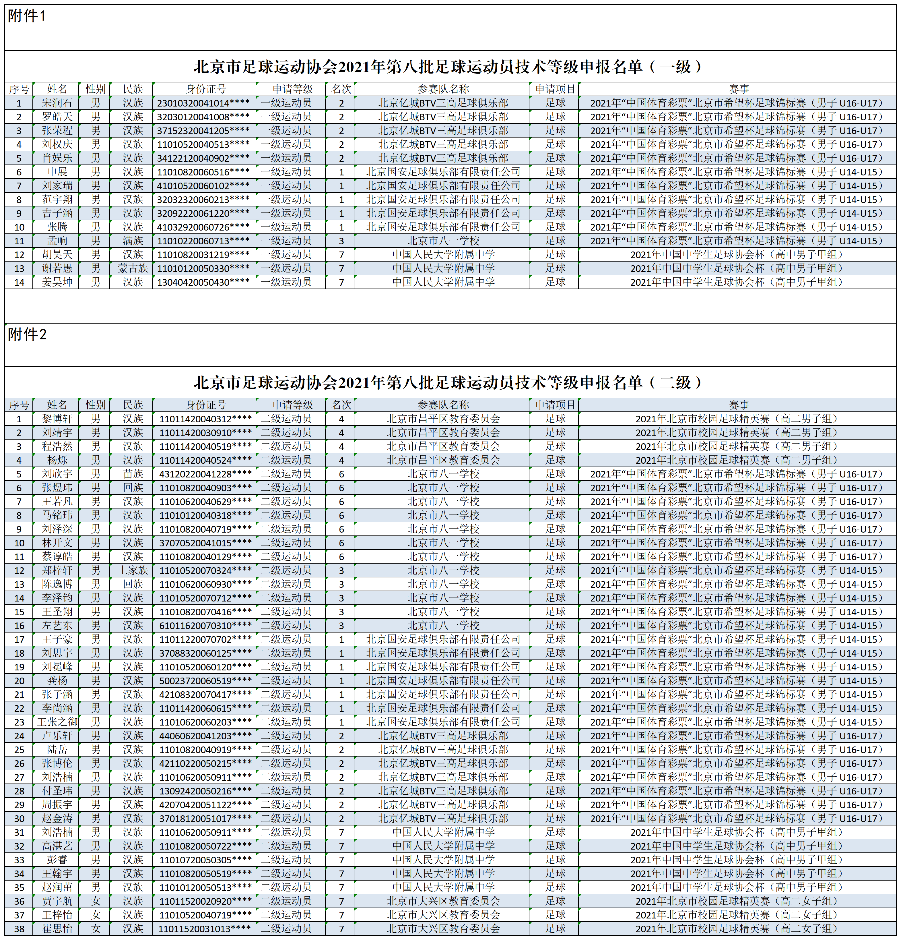 根据《中国足球协会足球运动员技术等级管理办法》和《中国足球协会足球运动员等级标准》(足球字〔2019〕699号)要求,现对拟授予一级运动员称号的宋润石等14人(见附件1)和二级运动员称号的黎博轩等38人(见附件2)进行公示。公示期为2021年12月13-17日。