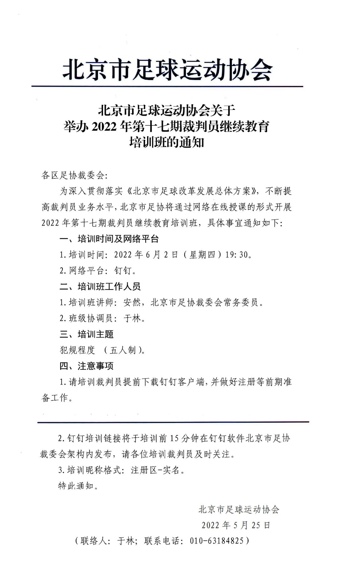 北京市足球运动协会关于举办2022年第十七期裁判员继续教育培训班的通知